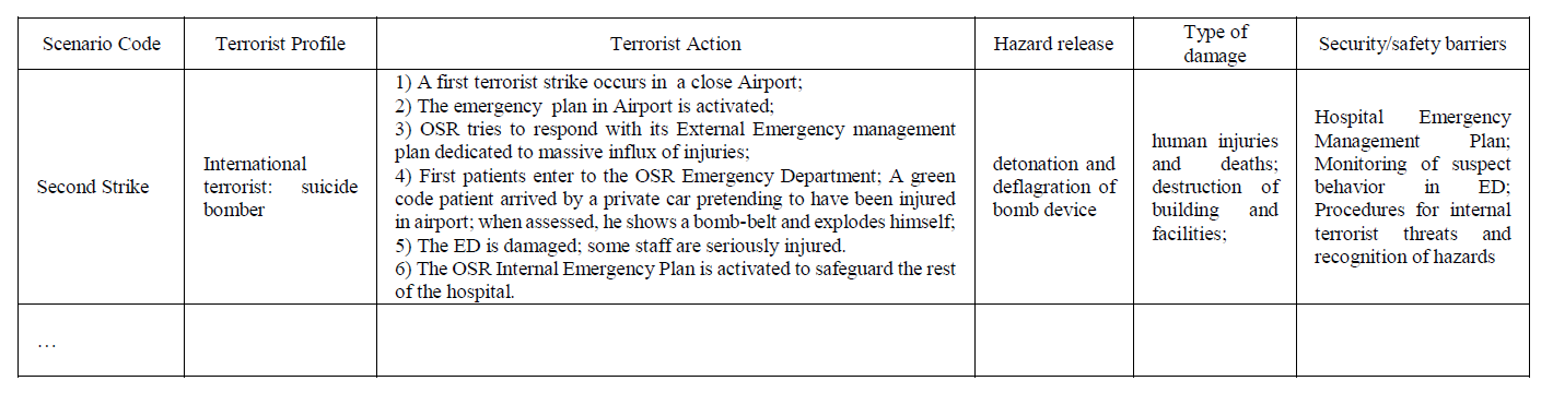 Knowing the critical assets attractiveness, we can brainstorm on scenarios of terrorist attacks: the most likely scenarios with the worst consequences are constructed, specifying in the following table: the terrorist profile, a potential terrorist action, the hazard release, the type of damage, and the existing security/safety barriers. The following table is shown as an example to present the related information about the different emergency situations.