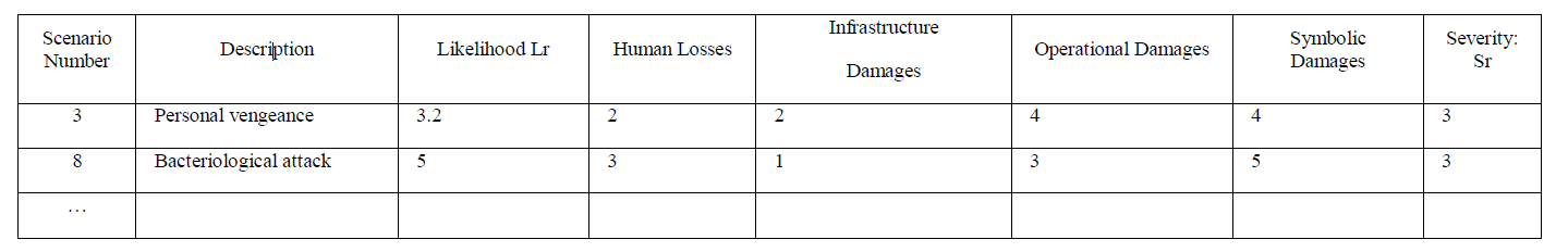 The objective of the risk assessment is to calculate the risk of the different scenarios. The following table is used as an example to show how we assess threat scenarios. The risk assessment approach applied to scenario estimations is based on the one hand on the following criteria (adversary capabilities, adversary motivation, criticality of assets, ease of asset access, human losses, infrastructure damages, operational damages, and symbolic damages) used for estimating the likelihood and severity criteria and on the other hand on the quantitative evaluation tool used (the linear flow model). Each terrorist scenario is fully developed, its likelihood (ease of causing a threat, and adversary motivation) as well as its severity (losses and damages) is estimated systematically and deeply. The combination of likelihood and severity shall provide an index representing the best combination of both criteria.
